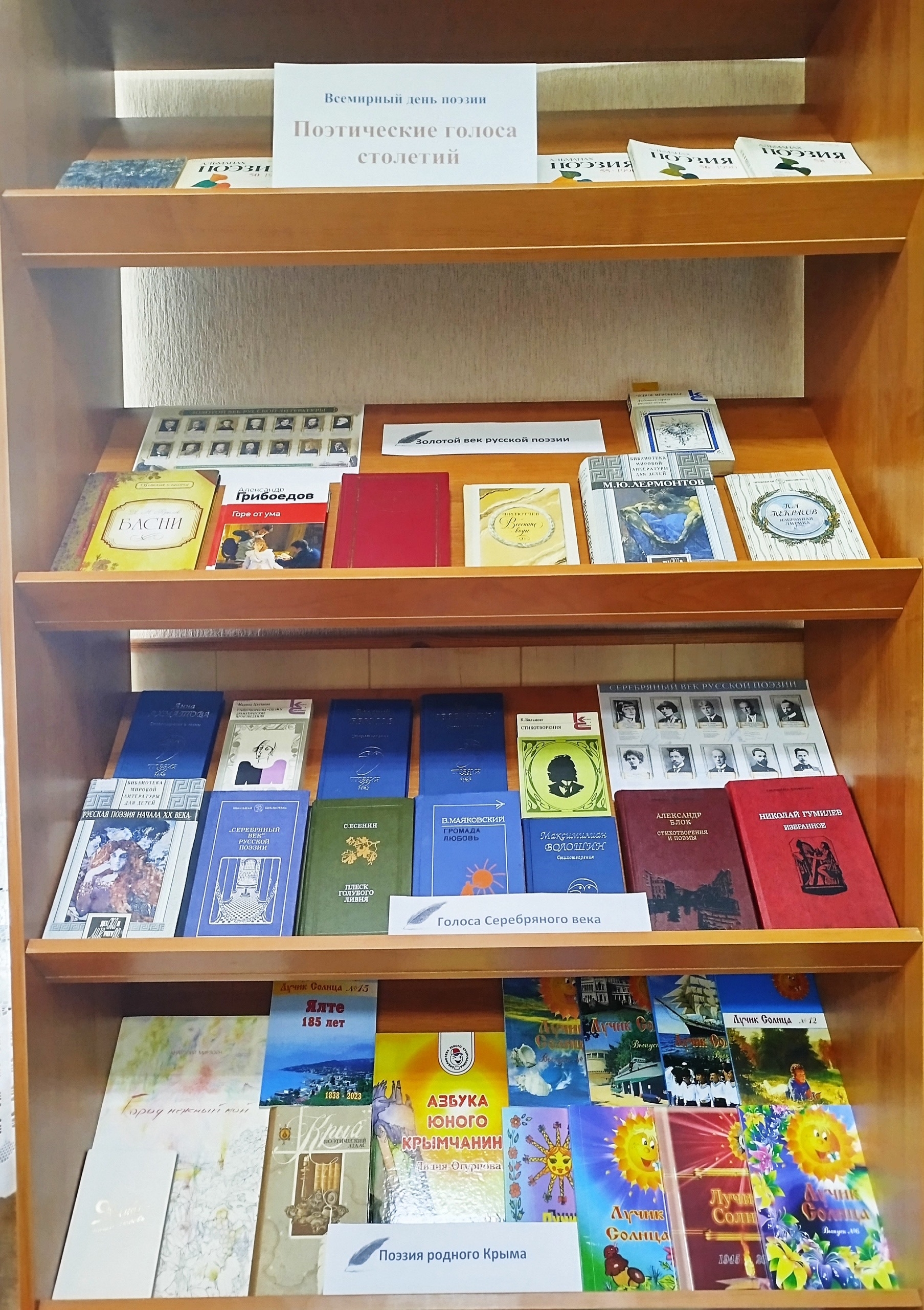 В рамках этого события в библиотеке Ялтинской средней школы № 7 была открыта книжная выставка «Поэтические голоса столетий». На ней представлены книги поэтов «золотого века», «серебряного века» и поэзия родного края.