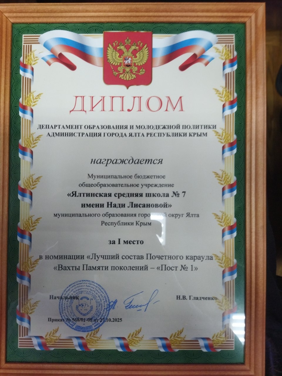 Почётный караул кадетских морских классов Ялтинской школы №7 занял первое место в осеннем этапе конкурса "Вахта Памяти поколений - пост №1". Также караул получил первое место в номинации "Боевой листок".