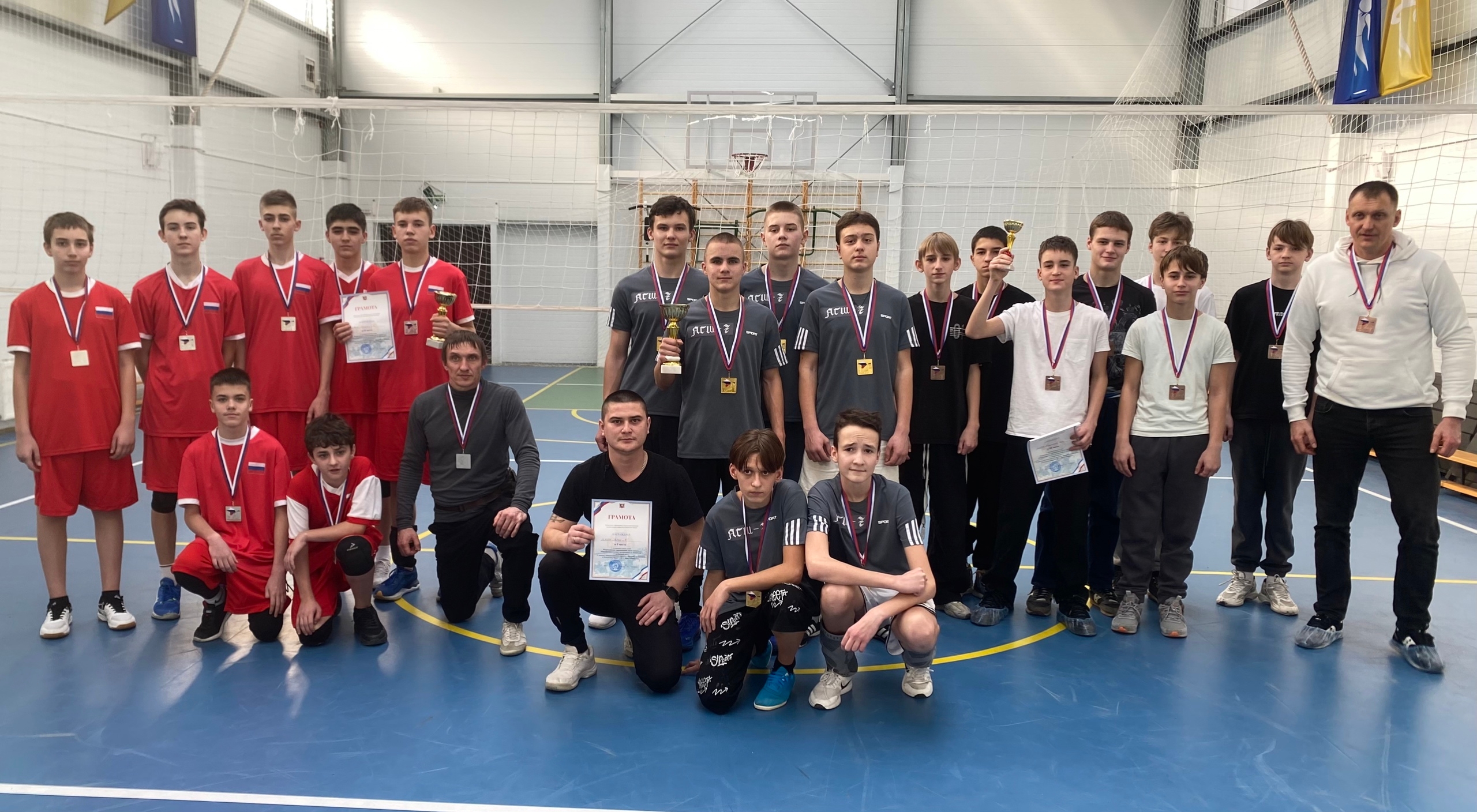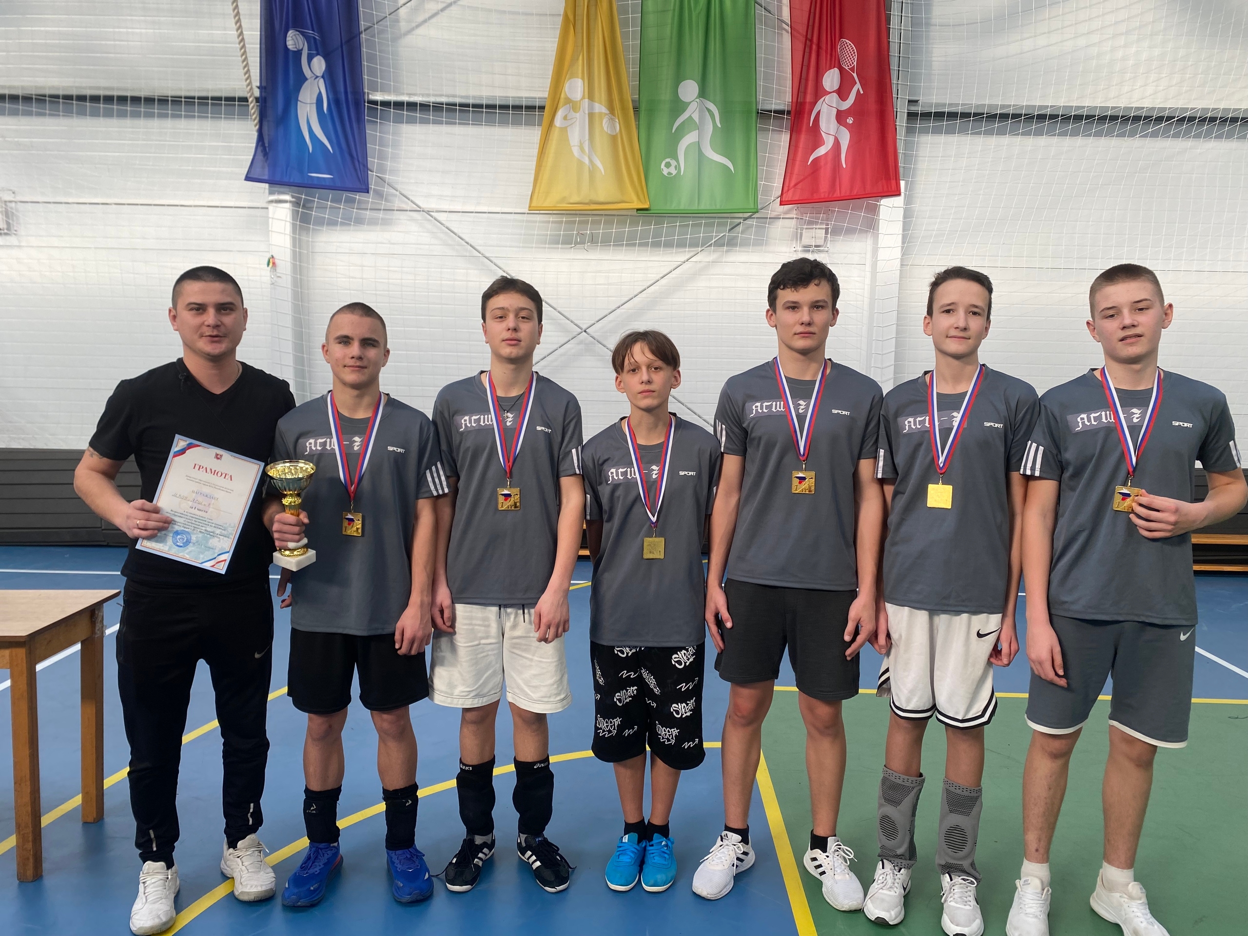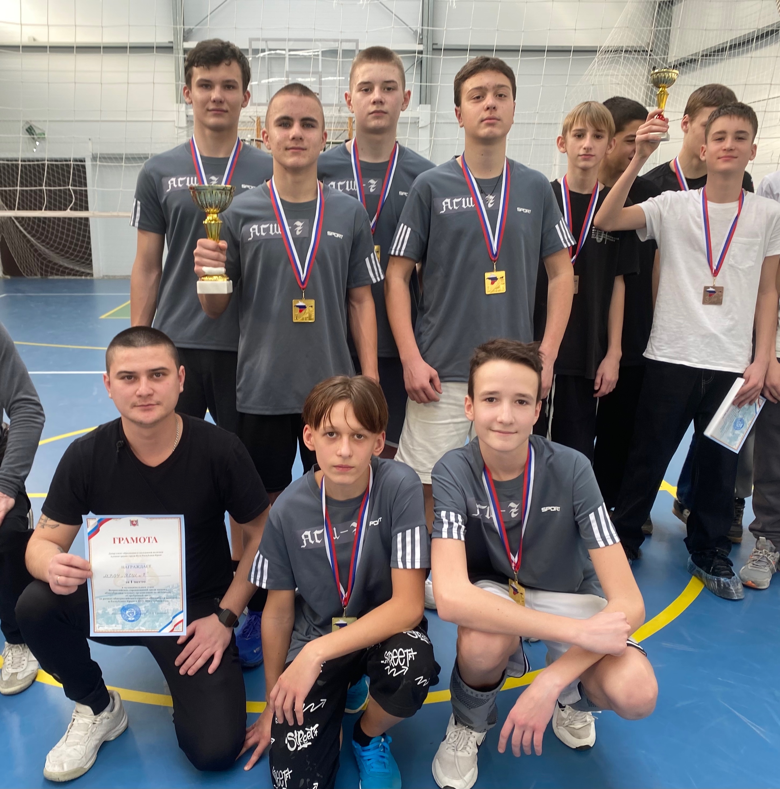 Поздравляем команду юношей и их тренера Эминовна Али Эсвета с яркой победой в муниципальных соревнованиях по волейболу «Серебряный мяч»!